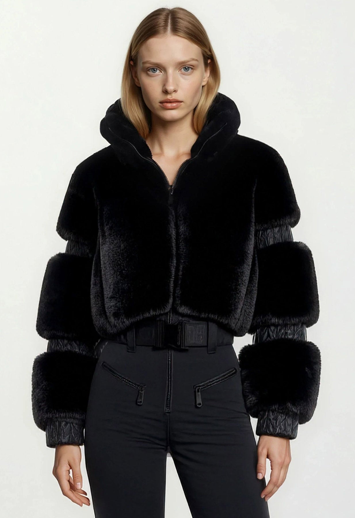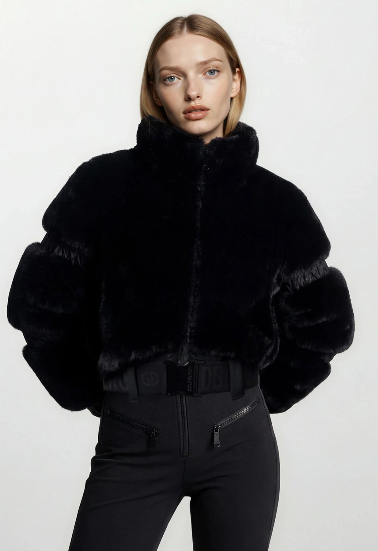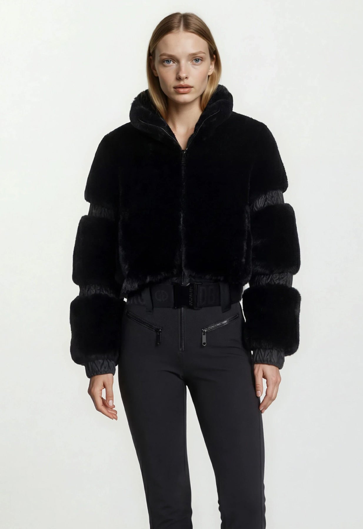 The beautiful Lieke ladies black faux fur ski suit by Goldbergh has a faux fur bodice and top and black stretchy trousers. As it is a ladies designer onepiece ski suit, the top and trousers are attached. This creates a contrasting look thats both cool and exciting on the slopes. The most subtle type of style and glamour (the best kind!) will be experienced when you wear this beautiful onepiece on the ski slopes. It's like wearing a faux fur ski jacket with black ski pants but it is an all in one ski suit!