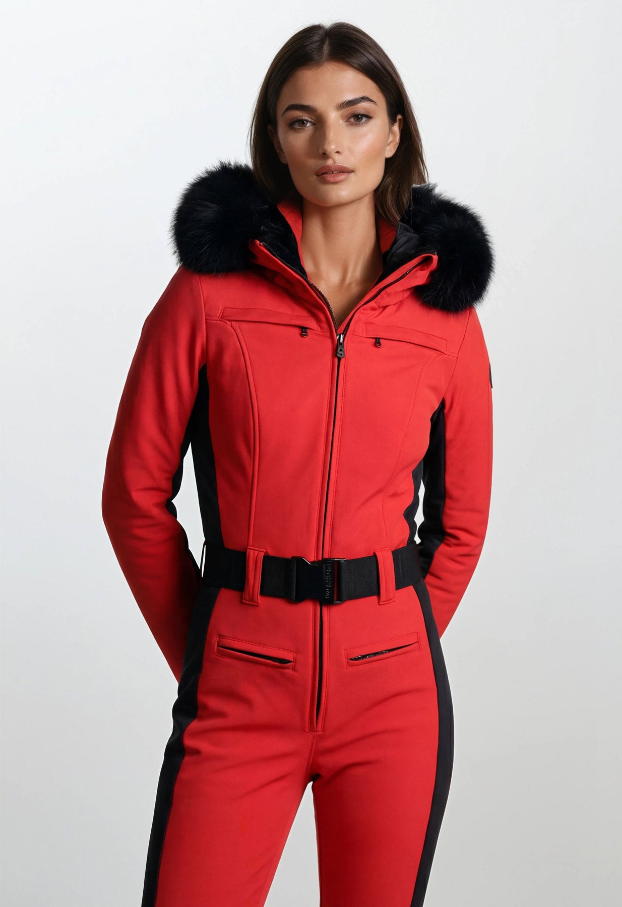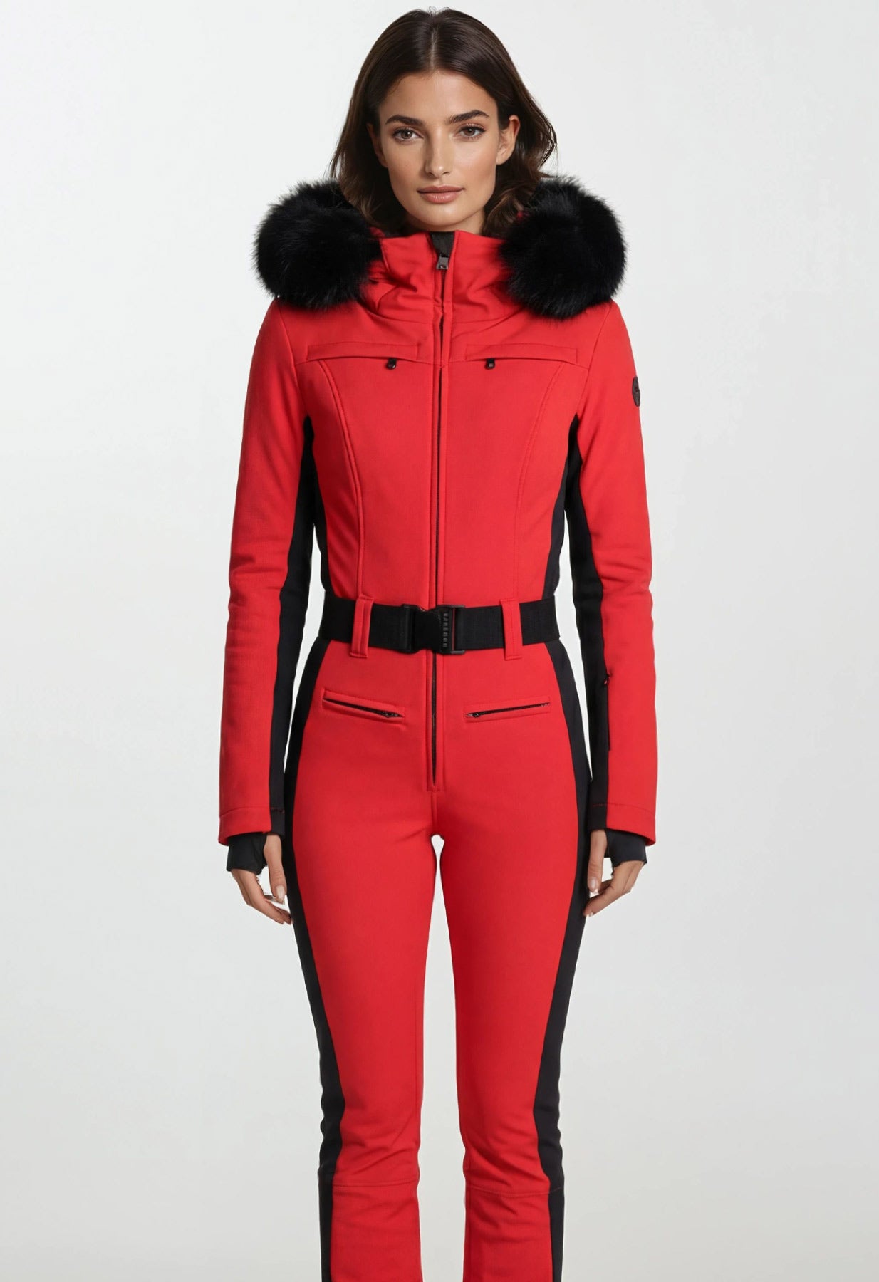 Parry is gorgeous bright red all in one ladies ski suit in Goldbergh's signature softshell stretchy fabric and it is so special, we had to include it in our collection of our luxury ski wear for women. With its slim fit, luxurious faux fur trimmed hood and contrasting black details, the Parry red onepiece by Goldbergh is a real stunner on the slopes. You can feel the quality of the downfilled insulation and the excellent performance fabrics and you'll benefit from being warm on the ski slopes.