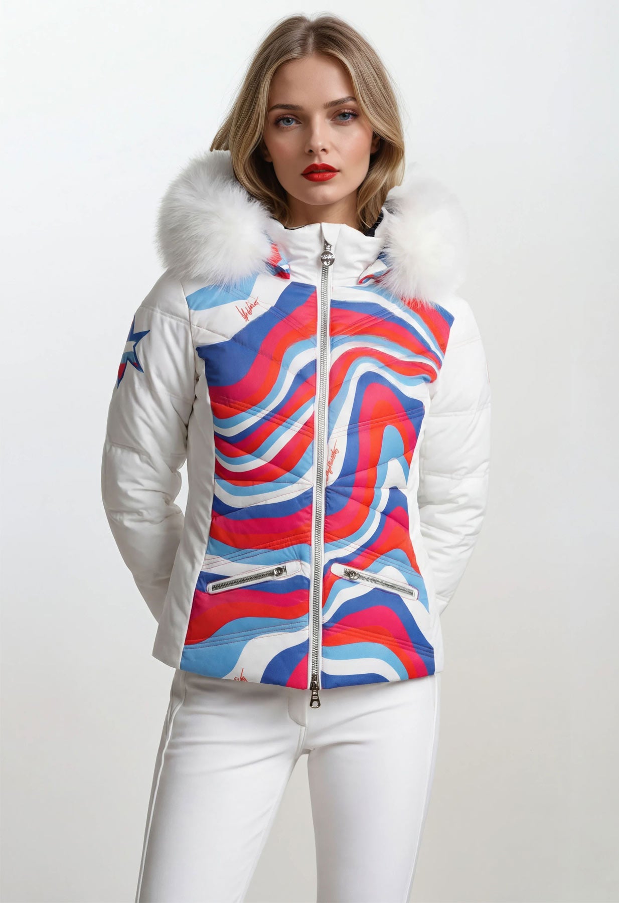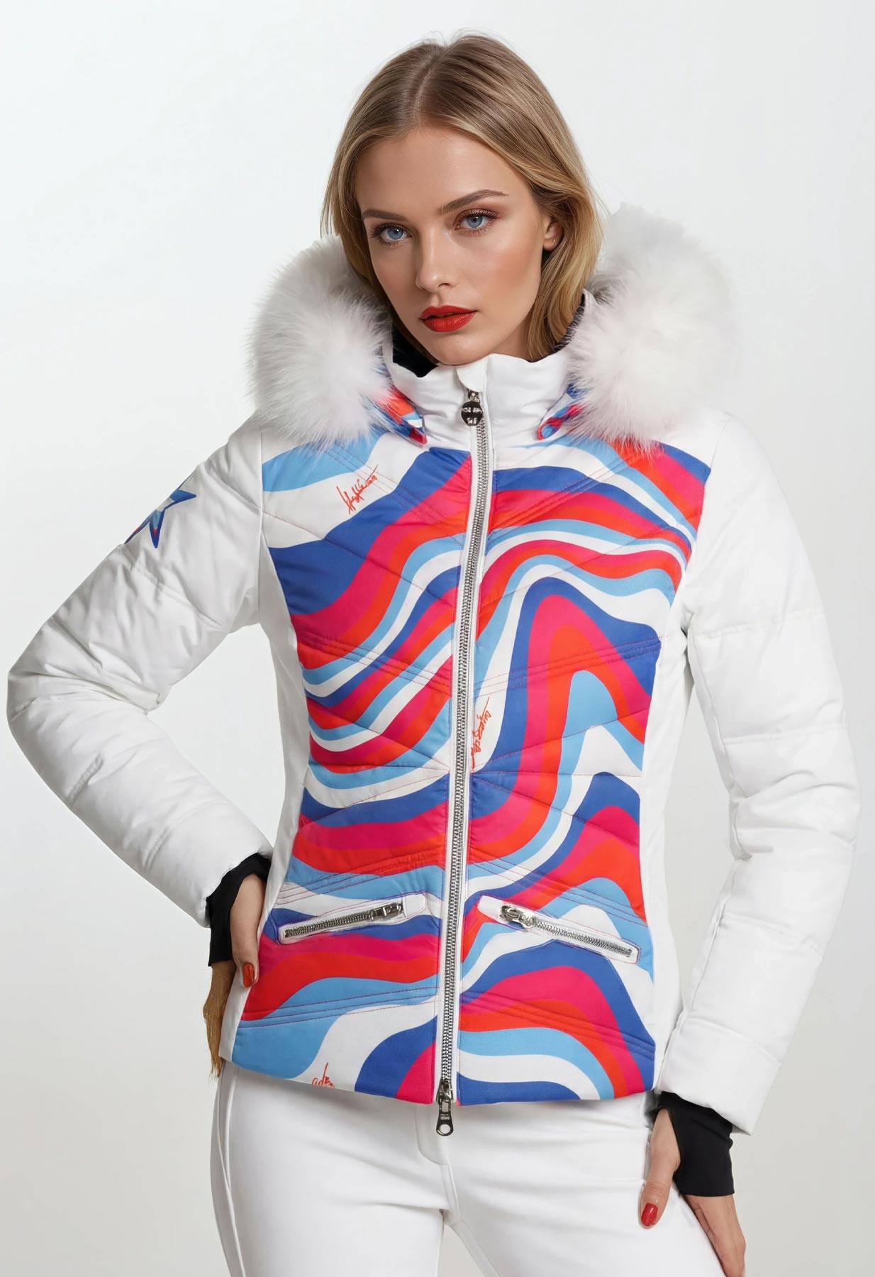 Designer downfilled premium womens ski jacket with a pink and white swirling pattern on the hood and bodice. Real fur trim in white on the hood. This is a luxury piece of women's ski clothing and will help create a stylish ski outfit.