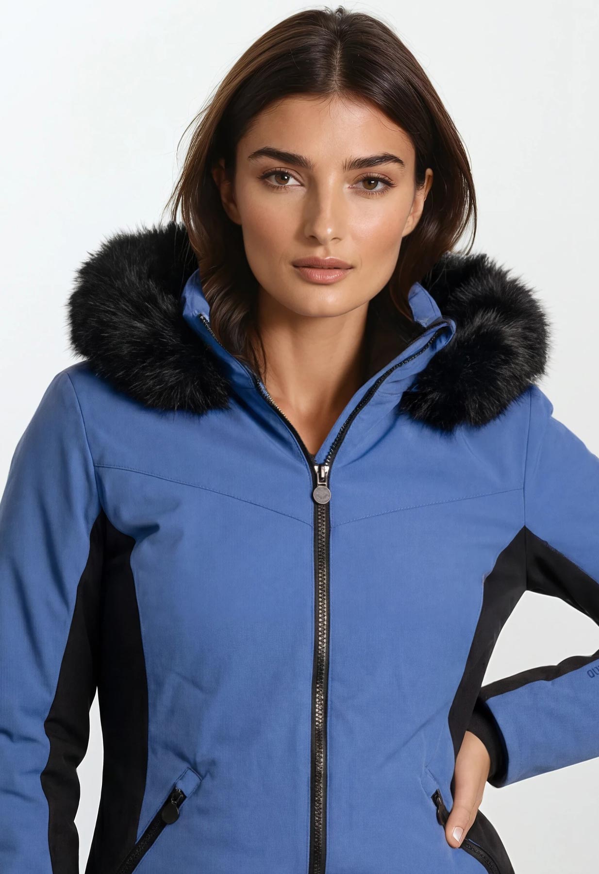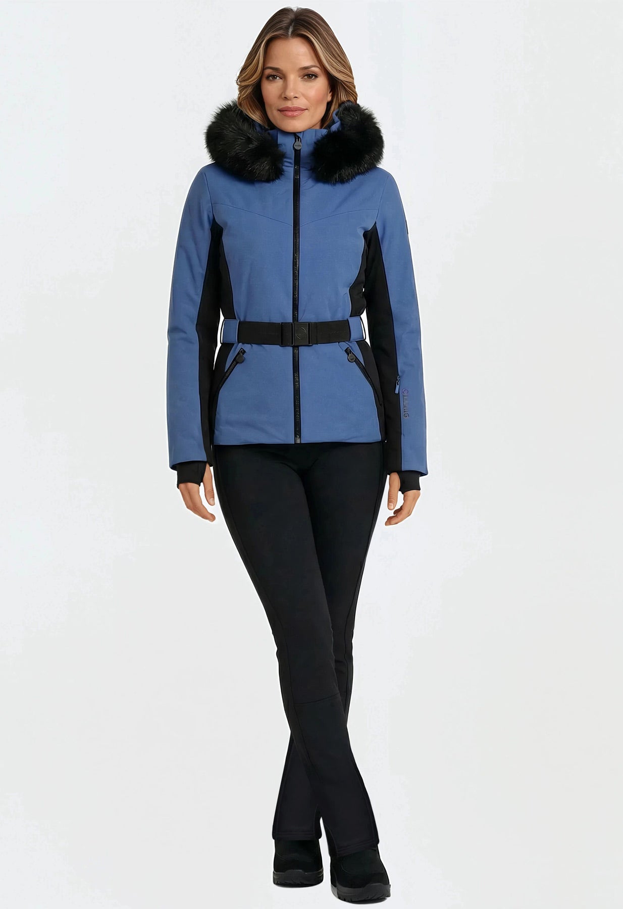 - Warm and waterproof longer length ladies blue ski jacket with faux fur hood