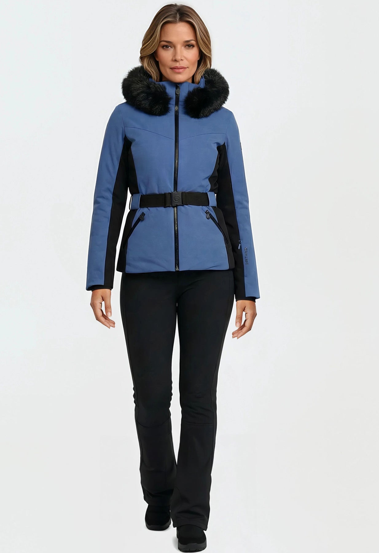 The Duvillard Estelle 2 Ladies Ski Jacket is proof that quality and style can go hand in hand. The colour is called Galaxy Blue by the French ski wear label Duvillard and is offset with black panels, black faux fur and black belt and zippers.