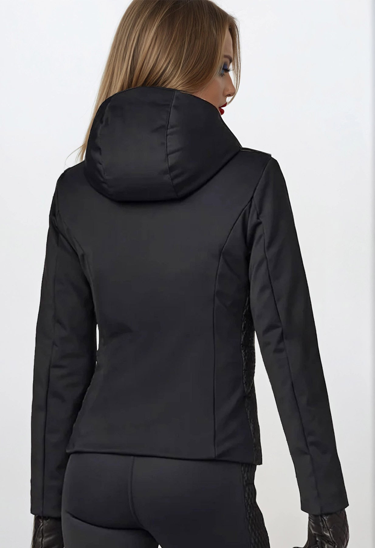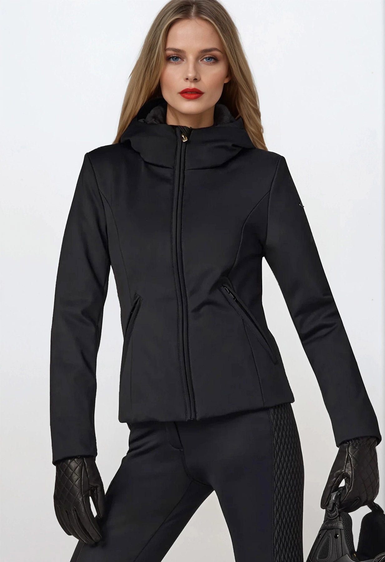This slim fitting, mid-length black ski jacket is made in a softshell fabric so it's warm, robust, long lasting and comfortable. The performance is as good as the look! Wear with some of our flattering ladies ski pants for a ski outfit with a minimal, elegant aesthetic.
