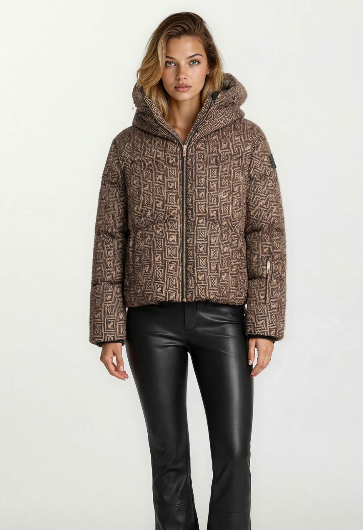 The brown camel tone contrasts with the N pattern to bring quiet luxury to the mountain — warm, sophisticated, and timeless. The signature NIKKIE logo is striking and luxurious. Designed with a high collar, full zip fastening, storm cuffs, and zipped front pockets, every detail has been considered for performance and ease.