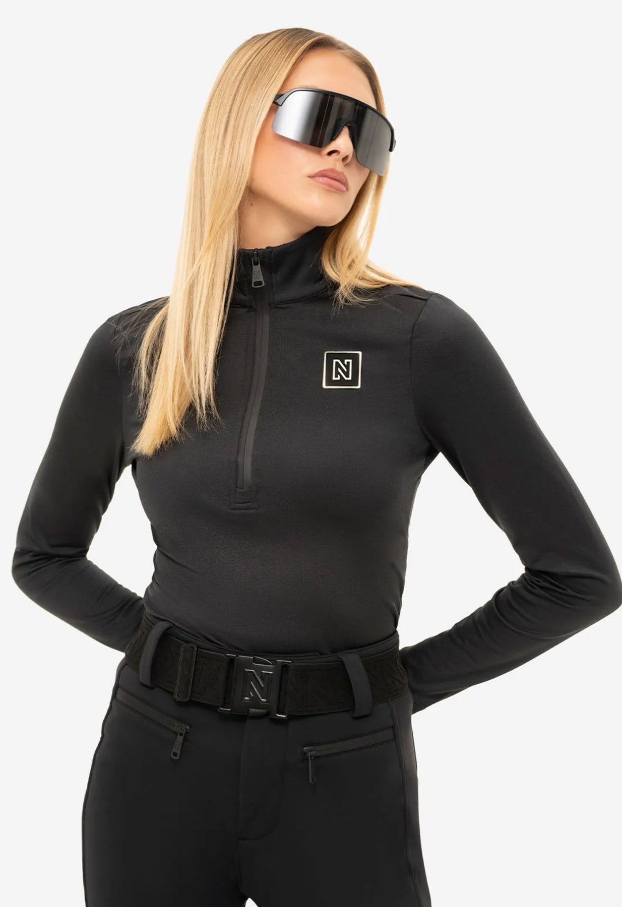 From the chest length zipper to the black and gold logo to the high quality fabric and flattering style, there's a lot to appreciate about this useful ski base layer. Feeling cold, zip it up to trap in extra warmth. Zip guard prevents chafing! Then when you feel warmer, relax the zipper to let in more air and have a more casual look. Key details elevate it from being plain as the logo is offset in gold contrasts and the fit is one of quiet luxury.